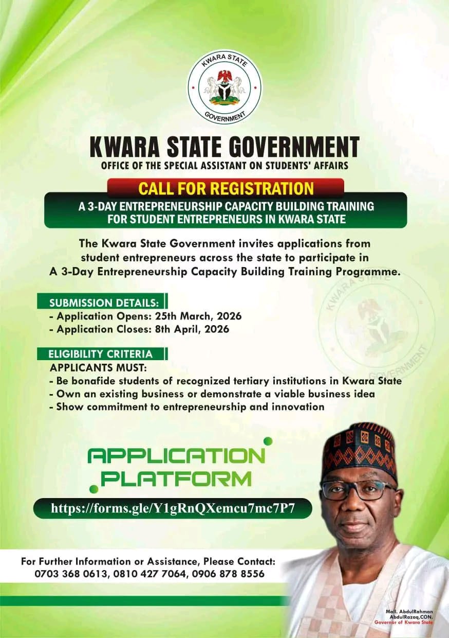 The Kwara State Government has announced the opening of registration portal for a 3-day Entrepreneurship Capacity Building Training designed specifically for student entrepreneurs across tertiary institutions in the state.
